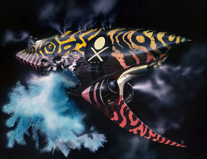 Dicho y hecho, Chris Foss, encargado de los vehículos espaciales, propuso una serie de naves que, si bien eran esencialmente mecánicas, tenían formas más cercanas a lo biológico que a lo maquinal; como esa suerte de pez-tigre-cebra que aparece en la imagen.