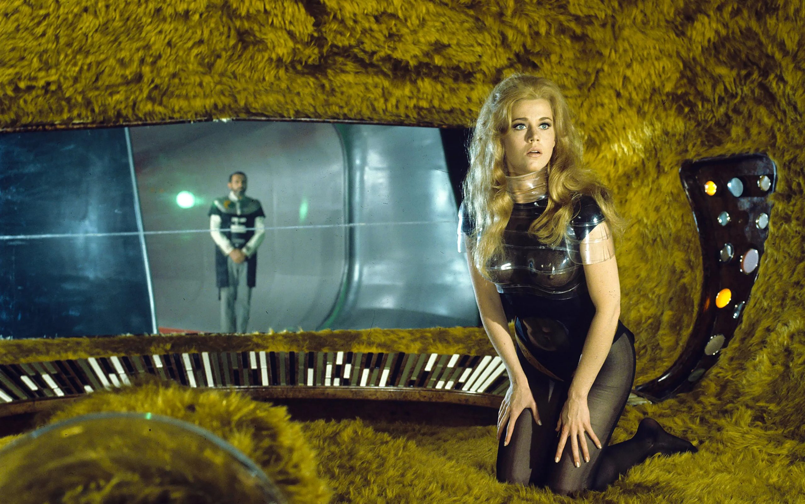 Pero ¿quién quiere eficacia, leyes físicas o siquiera una mínima relación con la realidad científica cuando tu película es el indisimulado producto del consumo de abundantes sustancias psicotrópicas? Quizás los astronautas de la NASA aceptasen de buen grado estar rodeados de cables y monitores, pero desde luego que Roger Vadim no iba a permitir que a su mujer le hiciese sombra un montón de ferralla tecnológica.