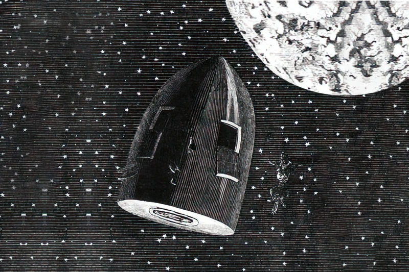 La pionera y algo ingenua manera que plantea Jules Verne para alcanzar nuestro satélite consiste en una cápsula con forma de bala que sería disparada desde un enorme cañón de tipo columbiad, minimizando así el uso del motor autónomo.