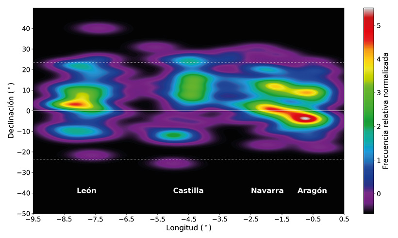 Camino de Santiago. Los máximos significativos se encuentran en color verde, amarillo y rojo, de menor a mayor