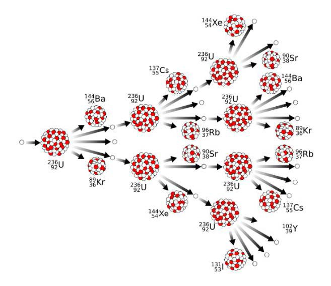 El mecanismo por el que se genera energía en un reactor nuclear es la fisión, una reacción que la científica austriaca Lise Meitner interpretó en 1938. Un núcleo pesado (²³⁵U) se rompe en dos nuevos productos más ligeros (productos de fisión) al impactar sobre él un neutrón de la velocidad adecuada (neutrón lento o térmico), liberando a su vez gran cantidad de energía y, lo que es más interesante, liberando dos o tres nuevos neutrones muy rápidos. Estos podrán impactar, tras reducir su velocidad, contra otros átomos pesados que se encuentren en su camino. Se producirá así una nueva fisión y nuevos neutrones que, a su vez, producirán otra fisión y otros neutrones, y así sucesivamente hasta «el infinito y más allá».
