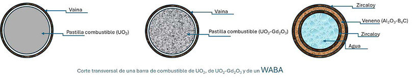 Años más tarde, pasé a diseñar el núcleo de una central más grande. El control ya no era tan sencillo. Además del boro disuelto en el agua, se necesitaban venenos para el control de los picos locales. En aquella época, en España se utilizaban unos tubos concéntricos de zircaloy rellenos de pastillas de carburo de boro y óxido de aluminio (Al₂O₃-B₄C), conocidos como WABAS (Wet Annular Burnable Absorber). Al no estar integrados en el combustible, estos venenos suponían un residuo que había que gestionar al finalizar el ciclo.