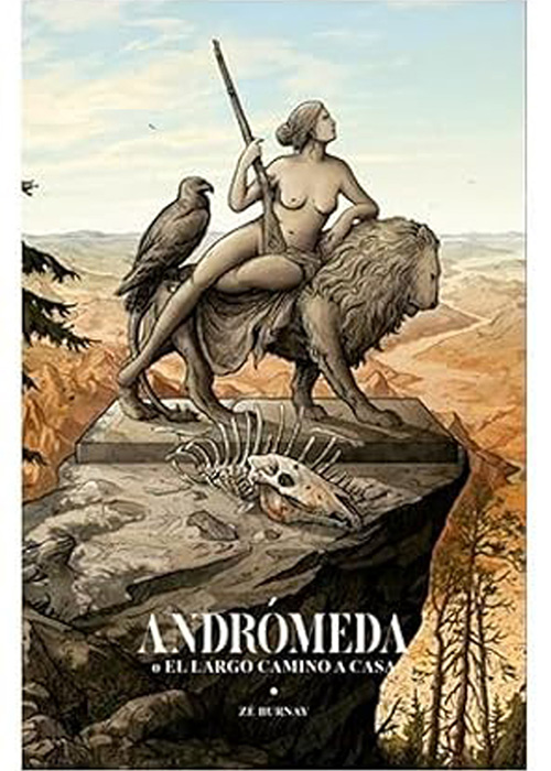 El cómic portugués cuenta con autores y autoras de enfoques, intereses y estilos muy interesantes que conviene ir conociendo y que no está de más que, desde el país vecino, les demos un empujón. Zé Burnay, natural de Sintra, es un prolífico autor con un ojo en el arte de una forma abierta y amplia, que mira al mundo natural y a lo cotidiano, pero también a los mitos y a las leyendas. En esa confluencia, Andrómeda o el largo viaje a casa recuerda a los cómics de fantaciencia de Métal Hurlant: su estilo de línea bien definida y su ensimismamiento en el escenario remiten sin remedio a Moebius, aunque con un espíritu más underground. Este taciturno relato del peregrinaje de su protagonista sitúa al lector en un ambiente postapocalíptico que se difumina con lo natural, en el que los elementos fantásticos y míticos —sustituyendo a lo fantacientífico— se muestran entrópicos, restos de un mundo que ya fue. Abandone el lector la idea de los pesados, complejos y enciclopédicos trasfondos: la presente obra se lee perfectamente sobre la marcha y se configura como una odisea solitaria, jugosa y extraña sin más.