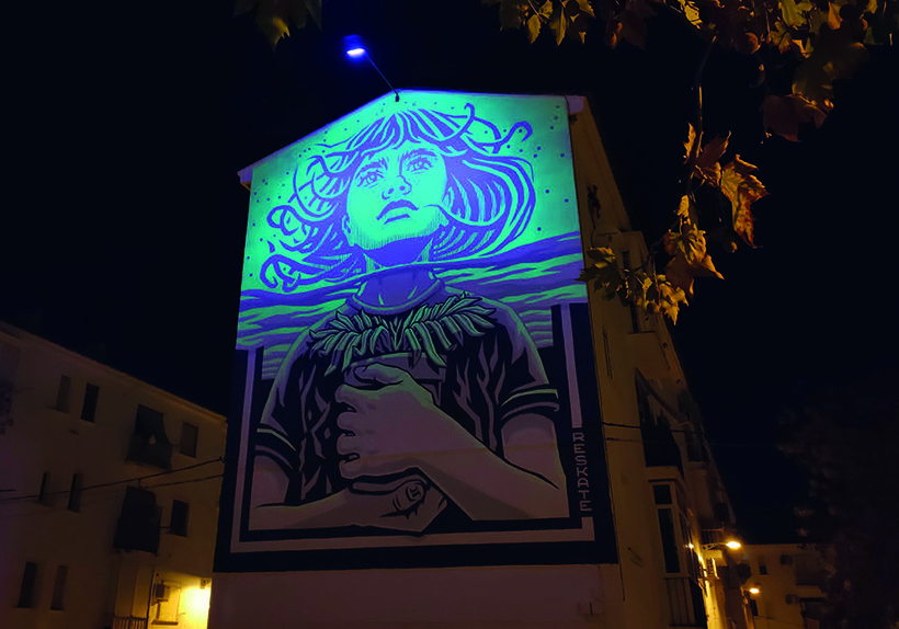 Creemos que nos hemos anticipado a tu pregunta. Pero sí, una de las partes interesantes de este proyecto es utilizar esta pintura fotoluminiscente tan especial de un modo expresivo. No solamente de manera decorativa o anecdótica. Nos parece muy poderoso el hecho de que aparezcan nuevos elementos en el mural durante la noche, de manera que la obra se puede interpretar de múltiples maneras. En su versión diurna puede generar incógnitas que se despejan al caer el sol. Por otro lado, al necesitar de una instalación de luz especial, es una buena manera de iluminar lugares oscuros de ciudades mediante el arte.
