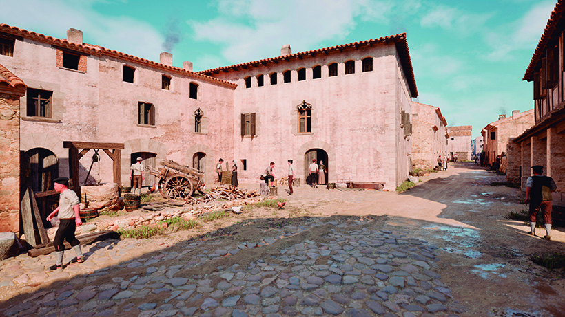 Actualmente hemos rehecho algunos detalles y añadido personajes al modelo para dotarlo de más vida. Se está produciendo una pequeña película en la que esos personajes interactúan mediante voces en off y desarrollan una historia basada en ese contexto histórico. Todo esto se apoya en la tecnología de renderizado en tiempo real, que deja abiertas las puertas a futuros desarrollos multiplataforma. Es un proyecto muy ambicioso: cubre un recorrido de aproximadamente kilómetro y medio, siguiendo el trazado del antiguo Camino Real —la vieja vía romana— y reconstruyendo unas 180 casas con sus edificios religiosos, el hostal y las grandes casas de los terratenientes.
