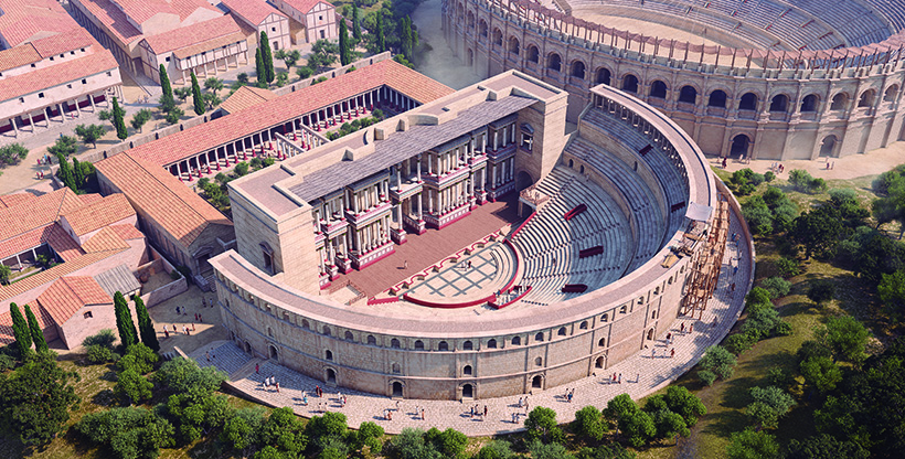 La reconstrucción en 3D de la ciudad romana de Augusta Emerita (la actual Mérida) con el teatro y el anfiteatro en primer término.